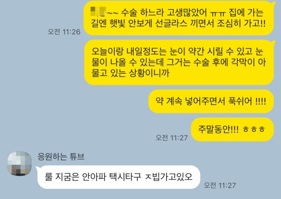 수술 아주 잘 됐고 각막도 잘 아물고 있다고 말씀해주셨어요!